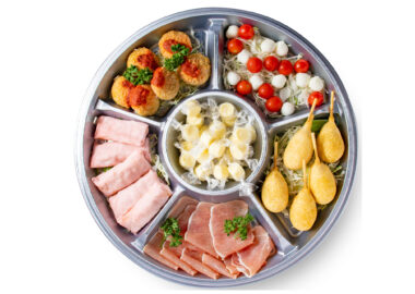 約25~30人様の集まり向けの商品で、ファーストデリバリーの盛り合わせ商品6種類にお寿司、サンドイッチが入ったセットでございます。