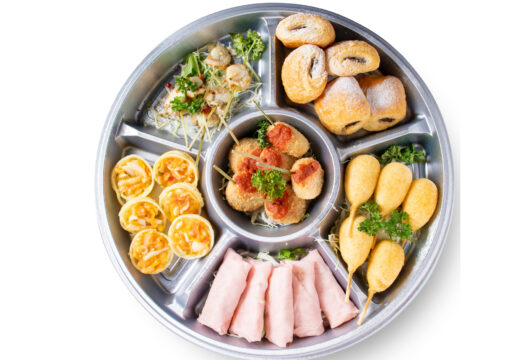 【内容】ポテトカップディッシュ、ライスコロッケ、ブリト―、ミニチーズドッグ、ホタテのピンチョス、チョコデニッシュ