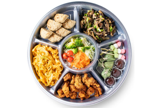 【内容】きのことブロッコリーのバジル和え、野菜サラダ、ソイ・ボロネーゼ、大豆ミート唐揚げ、プラントベースハンバーグ、和菓子盛合せ